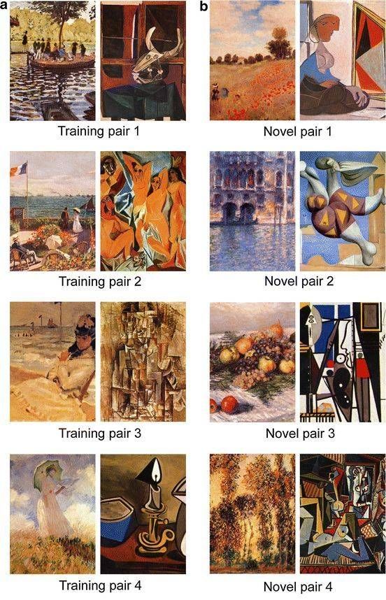 蜜蜂识别艺术风格实验示意图:上,整体示意图;下:为蜜蜂提供训练的两组莫奈和毕加索画作。这项实验表明,识别艺术风格等抽象概念,并不是人脑才具备的高级功能,蜜蜂的大脑也具备从视觉图像存储、特征提取、高度概括的高级功能。(图片来源:参考文献[3])