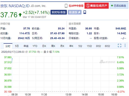 新浪科技讯 3月17日晚间消息,美股开盘京东涨超7%,报37.76美元。此前京东宣布,在未来24个月内,京东最多将回购20亿美元的公司股票。