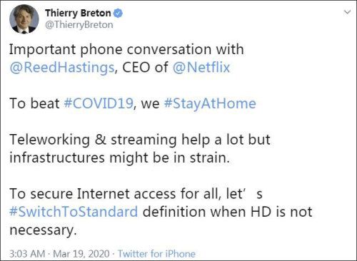 3月19日,布雷顿通过推特披露了双方的这次对话并称:为了抗击疫情大家都呆在家里,线上工作和流媒体帮了很大忙,但是网络设施也许会不堪重负。他呼吁用户:为保证所有人都能上网,不是必要情况,就别看高清视频了,我们看标清吧。