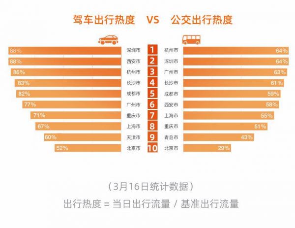 网易科技讯 3月20日消息,《高德地图出行暖报》显示,近一个月以来,全国主要城市通勤出行热度呈阶梯式快速回升态势。截至3月16日,全国范围驾车出行热度已经恢复至春节前正常水平的95.8%,公共交通出行热度回升至50.5%。