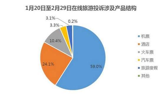 北青报记者了解到,与正常时期相比,疫情初期(1月20日至2月3日)的消费者投诉主要以退改相关问题为主,占比超过97%,与服务相关的消费者投诉约占2%。消费者投诉涉及产品结构方面,1月21日至2月29日,来自国内主要在线旅游平台的机票退票相关投诉大约占比59%,与酒店退订相关的投诉大约占比24.1%左右,火车票相关的投诉大约占比10.4%,汽车票方面的投诉大约占比3.3%,旅游度假投诉大约占比3.1%。