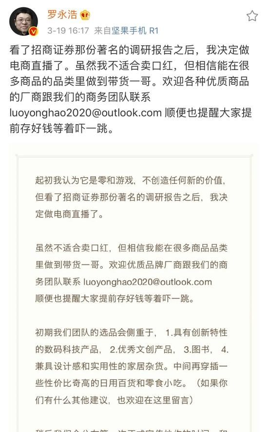3月19日,罗永浩在微博透露,“我决定做电商直播了”,而且要做“带货一哥”。当日,罗永浩就表示已收到上千封合作邮件。