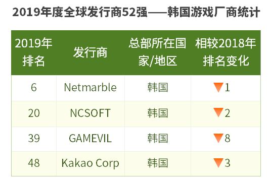 韩国方面,进入榜单的发行商仅有4家,相较去年减少2席。同时,各家排名都有所下滑,且无新人上榜。具体来看,韩国3N(NEXON、NCSOFT、Netmarble)表现依然较为稳定,GAMEVIL则因为2019年没有表现特别亮眼的产品,导致排名有所下滑。