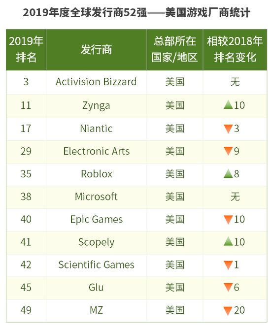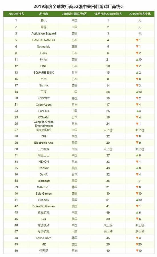 注:绿色箭头代表排名上升,红色箭头代表排名下降,下同 对比可见,美日韩三国2019年没有任何新游戏厂商入围52强,而中国却有4家,且绝大部分厂商的名次都有所进步,情况相当特殊。