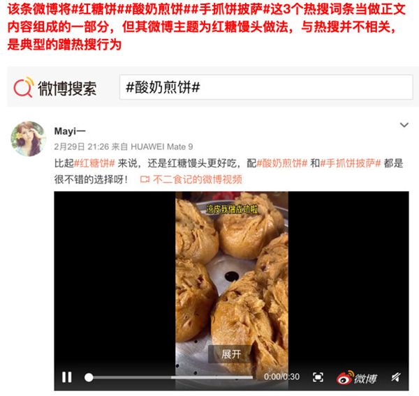 1、带热搜词发布与热搜本身不相关的内容:即生搬硬套、强行关联,将热搜词作为微博内容组成部分;在微博正文中添加多个互不关联的热搜词。