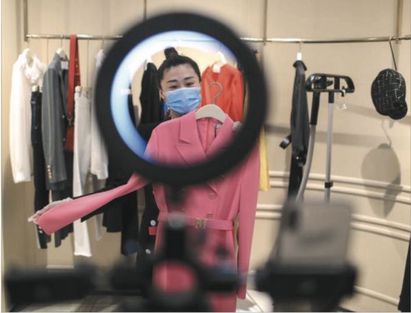 3月19日,海淀区翠微百货翠微店,一女装店铺开启商品直播等活动拉动销售。摄影/新京报记者 浦峰