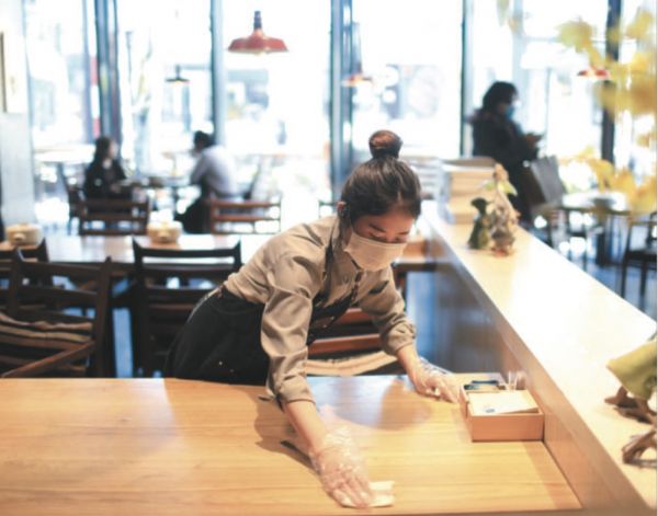 3月19日,五棵松华熙,一家餐饮店员工对用完的餐桌进行多次消毒。目前北京已出台13条具体措施,帮助个体工商户复工复产。摄影/新京报记者 浦峰