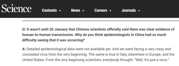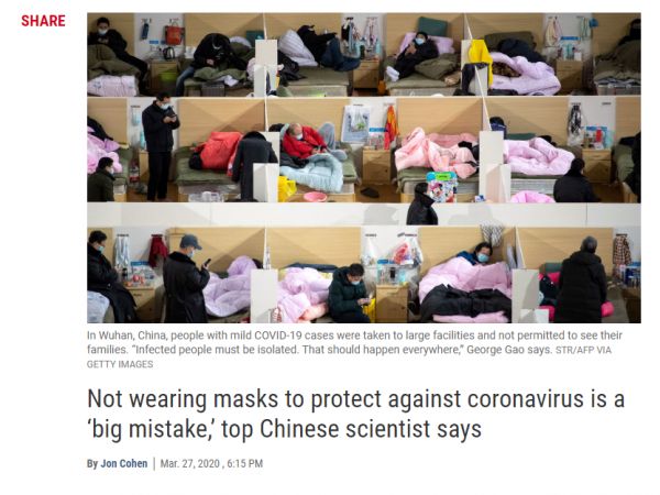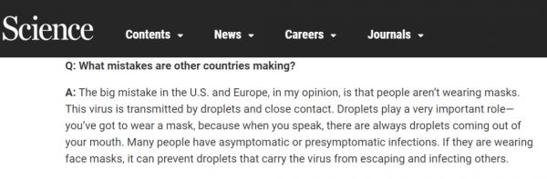 《科学》杂志对他的专访文章也表示:“中国顶尖的科学家说:在应对新冠病毒时不戴口罩进行保护是‘大错误’”。