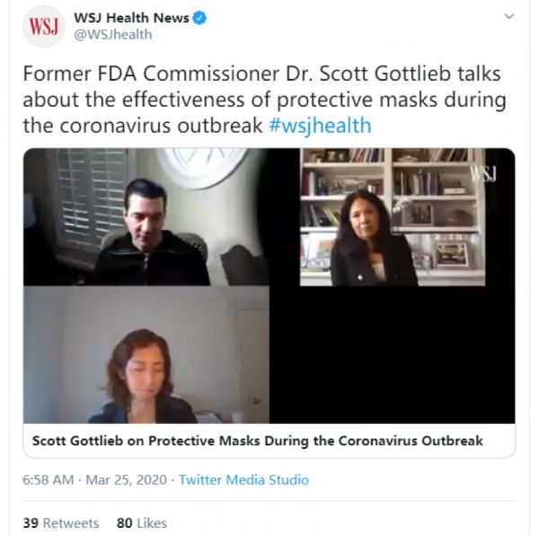但同为美国人的Scott Gottlieb却在一段采访视频中表示,他认为如果所有人出门都能戴口罩,是可以大大降低无症状感染者通过飞沫病毒传播给他人的风险的,而且对于流感的研究也证实了口罩其实可以降低5成左右的传染风险。
