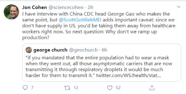 这段对于中国人来说早已成为“真理”,但对欧美国家的来说还“满不在乎”的信息,也被采访高福的《科学》杂志记者Jon Cohen发到了他的个人社交账号上。