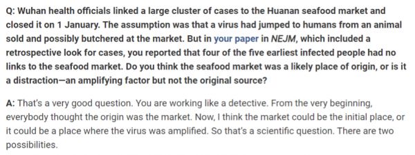而在被问到病毒到底源自哪里,是不是11月就出现在武汉时,高福则表示科学家正在努力搞清楚病毒的来源,但如今看来武汉的华南海鲜市场并不一定是最初每个人都以为的源头了,也有可能只是疫情出现加剧的一个地方。不过,他也表示目前没有足够证据证明病毒早在11月就出现在武汉了。
