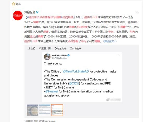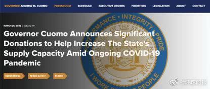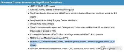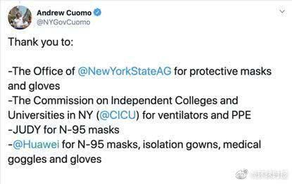 26日,纽约州州长库默在政府官网公布了一份企业/个人捐赠名单,表示已收到包括高盛、脸书、欧莱雅、沃尔玛在内的多家大型公司、慈善组织和歌手蕾哈娜、演员Kelly Ripa等明星捐赠的抗疫物资或个人防护用品,并对这些捐赠企业、组织或明星个人表示感谢。值得注意的是,这份名单中出现了一家中国企业华为。名单显示,华为向美国纽约州捐赠了10000个N95口罩、20000件防护服、10000只手套和50000个护目镜。其后,纽约州州长库默还在其个人推特再次点名感谢了华为公司的捐赠。