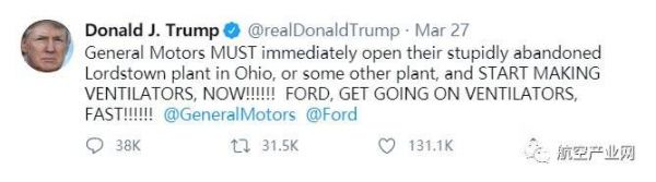 “通用汽车必须立刻重开他们那被愚蠢地弃用的洛德斯敦工厂,或者其他什么工厂。开始制造呼吸机,现在!!!! 福特,快去造呼吸机。@通用汽车 @福特”