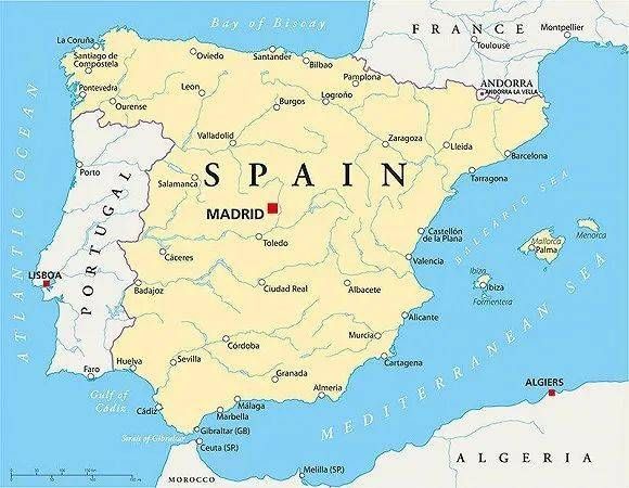 地处伊比利亚半岛的西班牙在欧洲最南端,东北部与法国接壤、西北是大西洋,西面包裹住葡萄牙,东临地中海,南边则是著名的直布罗陀海峡,与非洲相望。