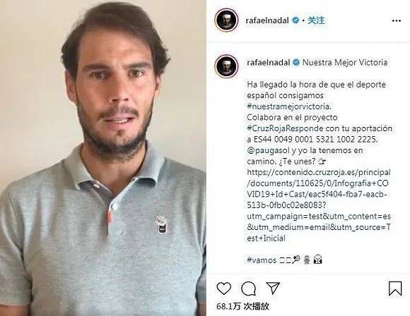 新冠肺炎疫情当前,3月26日,西班牙网球天王拉法·纳达尔和篮球巨星保罗·加索尔联手发起“最有意义的一场胜利”活动,号召西班牙体育界共同努力,筹集1100万欧元善款为深陷疫情的祖国购买医用物资。