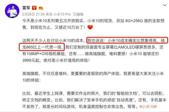 雷军此前曾在微博中提及,骁龙865的价格比上一代贵一倍。除了芯片本身,在高通的售卖机制下,还要考虑一起打包出售的X55 5G基带和RF射频天线模组的价格,此外,专利费、增值税等也是拉高厂商成本的重要因素。