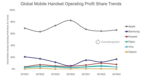 据Counterpoint的数据,2019年第三季度全球手机高端市场中有52%的份额被苹果占据,25%被三星占据,中国厂商华为和一加分别占了12%和2%。也就是说,全球四分之三的高端市场依然掌握在苹果和三星手中。