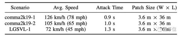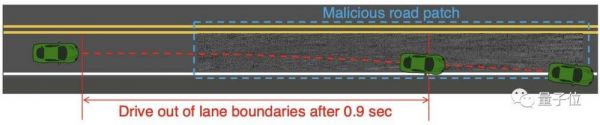 在论文中,他们使用不覆盖车道线的“脏路补丁”作为攻击载体,在最先进的开源车道保持辅助系统OpenPilot上测试:攻击126公里时速的车辆,只需要0.9秒就能让它失控;72公里时速行驶下的汽车,只需要1.3秒。