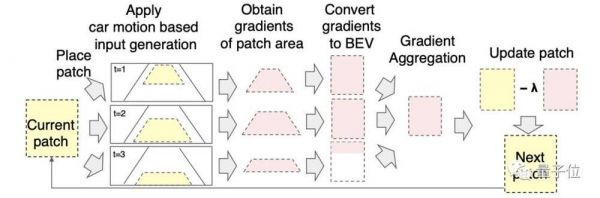基于这样的目标函数,可以得到每个摄像机输入的梯度。但梯度下降并不能直接适用于更新恶意路面修复补丁。