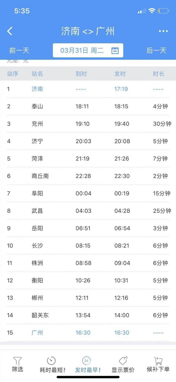 3月28日抵达广州后,这列火车变更班次为T180,调转方向开回济南,到达后,再变成T179次,从济南前往广州。