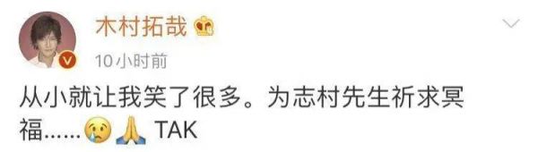 知道志村健去世的消息后,木村拓哉在微博上发文表示悼念,“从小就让我笑了很多,为志村先生祈求冥福。”