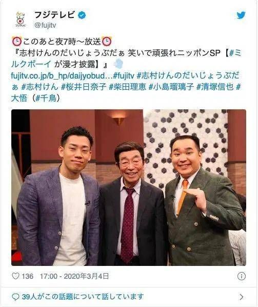 不过令人心痛的是,就在志村健确诊新冠的前几日,他还在认真工作,《志村大爆笑 笑一笑加油吧日本special》在3月4日播出,志村健与当下热门的搞笑组合牛奶男孩一起创作的漫才(注:日本的一种类似于相声的短剧)才刚刚在节目中首次发布。