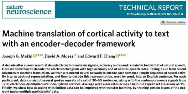 3 月 30 日,《自然-神经科学》发表了美国加州大学旧金山分校华裔教授 Edward Chang 及同事开发的一款脑电波 AI 解码器,能够将大脑活动信号直接转化为句子文本。