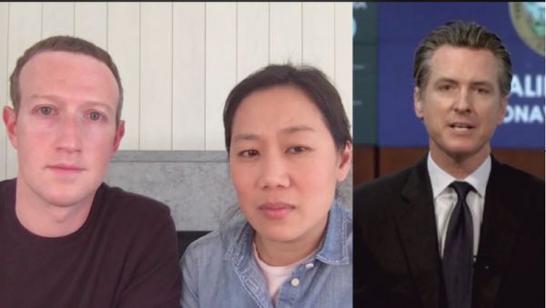 图:美国加州州长加文·纽瑟姆(右)与Facebook首席执行官马克·扎克伯格及其妻子普莉希拉·陈就新型冠状病毒疫情相关问题进行对话