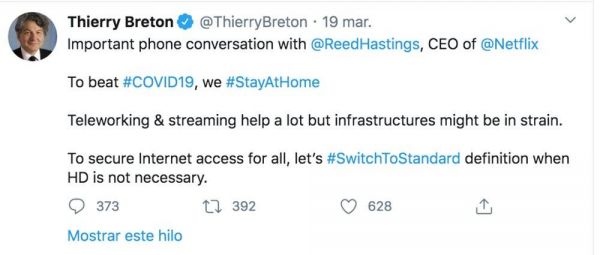 疫情爆发初期,预见到宽带网络可能吃紧,欧盟内部市场和服务专员蒂埃里·布雷顿(Thierry Breton)敦促流媒体平台考虑限制视频码率,以避免流量过载,影响在家办公人群。
