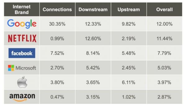 SANDVINE 的统计显示 2019 年全球 60% 的下行流量被视频服务占据,Google、Neflix、亚马逊、微软和苹果等 5 家公司则瓜分了全球 43% 的流量,这几家公司都拥有大量流媒体业务,其中,拥有 YouTube 的 Google 排名第一,Netflix 仅以微弱的差距位列次席。