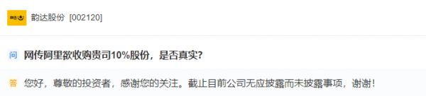 阿里收购10%股份?韵达:无应披露而未披露事项