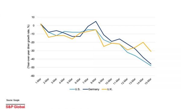 标普测算,3月前两周,美国餐饮业销量同比降幅50%,并提示餐饮业面临大幅评级下调风险。图中淡蓝色显示美国市场变化