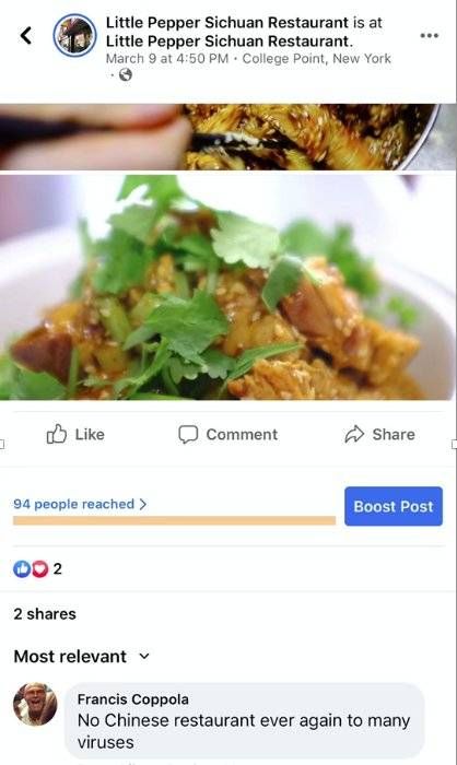 在餐馆用于互动的社交媒体页面上,有陌生人留言称,“不要去中国餐馆,有病毒”。