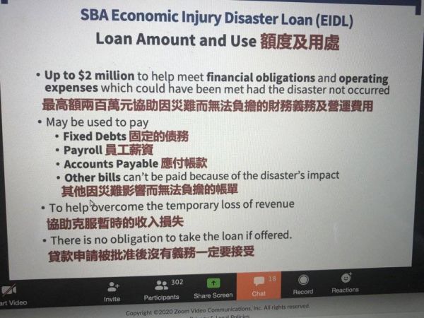《棱镜》观察到,人们对美国联邦中小企业局专员在纽约的政策线上讲解需求旺盛,一场超过300人。图中展示为目前美国联邦经济受损灾难贷款的额度和用途。