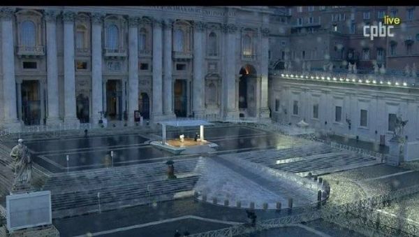 2020年3月27日,教宗方济各在雨中来到圣伯多禄大殿前,通过直播与教众祷告。