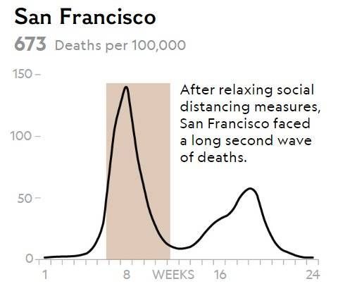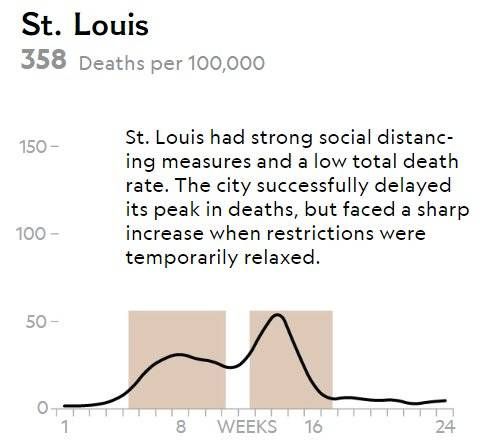 在旧金山,政府看到疫情缓解后取消隔离措施,不久就出现了一次持续时间更长的疫情暴发期。圣路易斯市暂时放开隔离管制后,死亡人数急剧增加,即使再次恢复隔离也难以遏制。