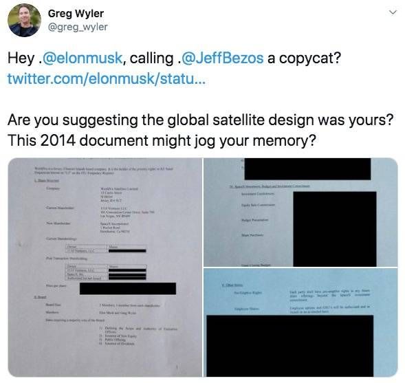 去年4月,Greg Wyler还公开叫板马斯克:你说Jeff Bezos是模仿者,你是在暗示全球卫星设计是你的吗?这份2014年的文件可能会唤起你的记忆?