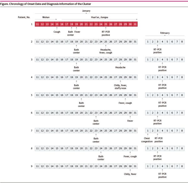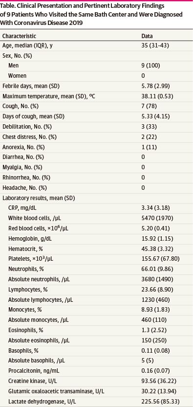 研究人员分析了江苏淮安第四医院于1月25日至2月10日收治的9名男性新冠肺炎确诊患者信息,这9人曾去过同一家洗浴中心。