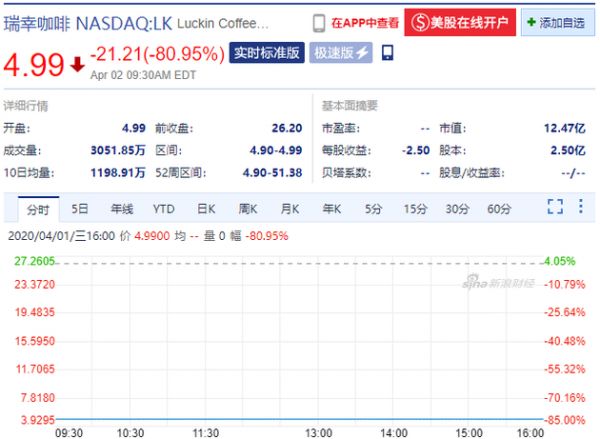 新浪科技讯 4月2日晚间消息,瑞幸咖啡美股开盘暴跌逾80.95%,报4.99美元。