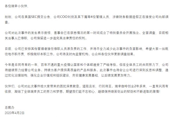 瑞幸在内部发文号召员工共度难关。《科创板日报》记者获得的一封内部信显示,瑞幸称对此次事件发生表示震惊,目前相关当事人已停职且其负责工作已安排其他管理者接任,并将尽力减少此次事件的负面影响。公司呼吁员工不忘初心,继续做好本职工作,称“道阻且长,行则降至”。