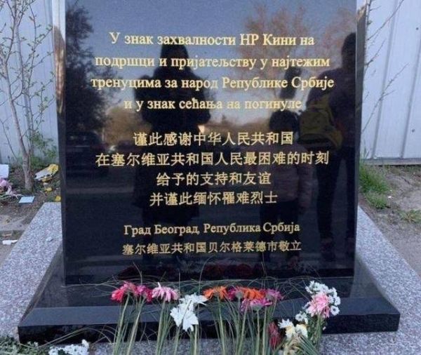 后来,塞尔维亚在大使馆的废墟上建起一座草地公园和一块纪念碑,二十年如一日的维护打理。公园上的那块纪念碑,用中文和塞尔维亚语写着: