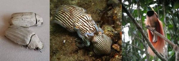 从左到右:白金龟、条纹睡衣鱿鱼、极乐鸟| 图片来源:Wikipedia