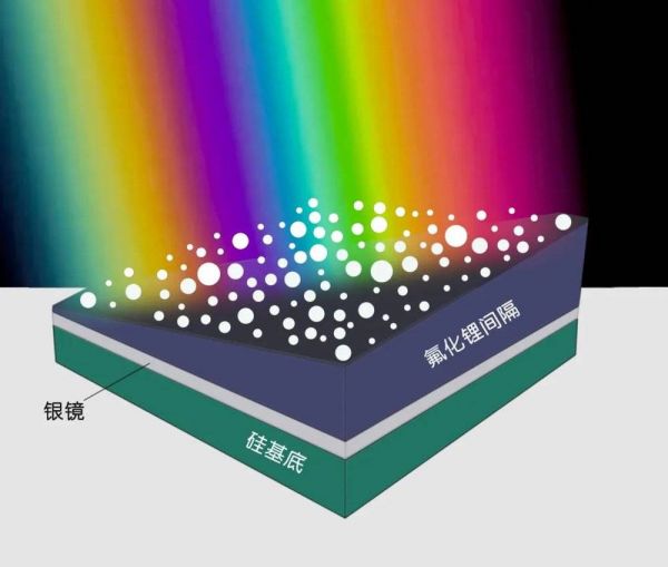 纳米级的银粒子颗粒在沿对角线逐渐变化厚度的透明腔体层之上。| 图片参考来源:[1]