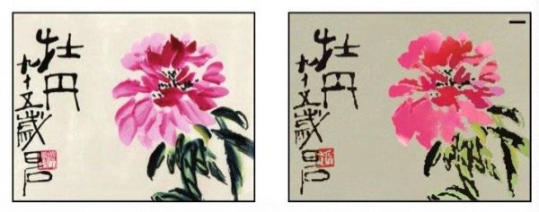 研究中重现的齐白石画作《牡丹》,左边为原始作品,右边为重现作品| 图片来源:[1]
