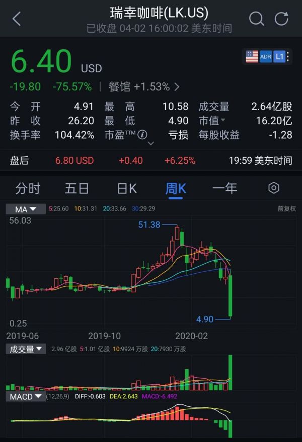 4月2日,受此影响,美股开盘前,瑞幸咖啡盘前跌幅逾80%,盘中曾暂停交易6次。截至当日收盘,瑞幸咖啡报每股6.4美元/股,较上一交易日跌75.57%。