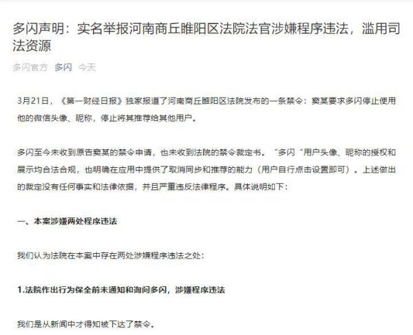 网易科技讯 3月22日消息,今天,多闪发布声明称“实名举报河南商丘睢阳区法院法官涉嫌程序违法,滥用司法资源。”多闪在官方声明中表示,多闪至今未收到原告窦某的禁令申请,也未收到法院的禁令裁定书。