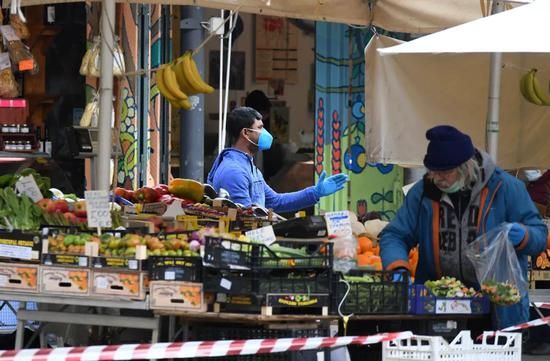 4月2日,在意大利首都罗马,人们戴着口罩在市场购买蔬果。新华社发(埃丽萨·林格利亚摄)