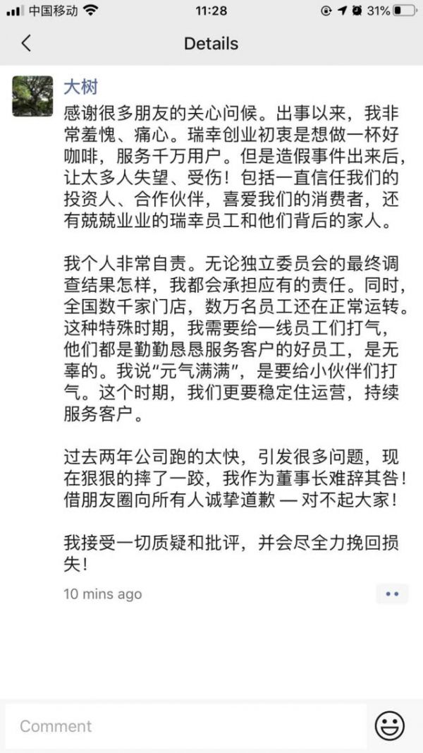 感谢很多朋友的关心问候。出事以来,我非常羞愧、痛心。瑞幸创业初衷是想做一杯好咖啡,服务千万用户。但是造假事件出来后,让太多人失望、受伤!包括一直信任我们的投资人、合作伙伴,喜爱我们的消费者,还有兢兢业业的瑞幸员工和他们背后的家人。