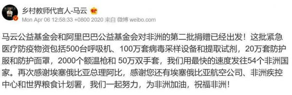 此前,3月16日,马云公益基金会和阿里巴巴公益基金会表示向非洲54国每一个国家捐赠10万个口罩、1000件防护服、1000个防护面罩及2万个检测试剂盒,并将与非洲各国医疗机构合作,提供新冠病毒临床治疗网上培训资料,支援非洲防控疫情。