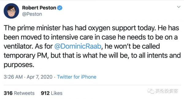ITV记者Robert Peston则称,首相确实在今天接受了氧气治疗,但还未使用呼吸机,进入ICU是以防需要使用呼吸机。